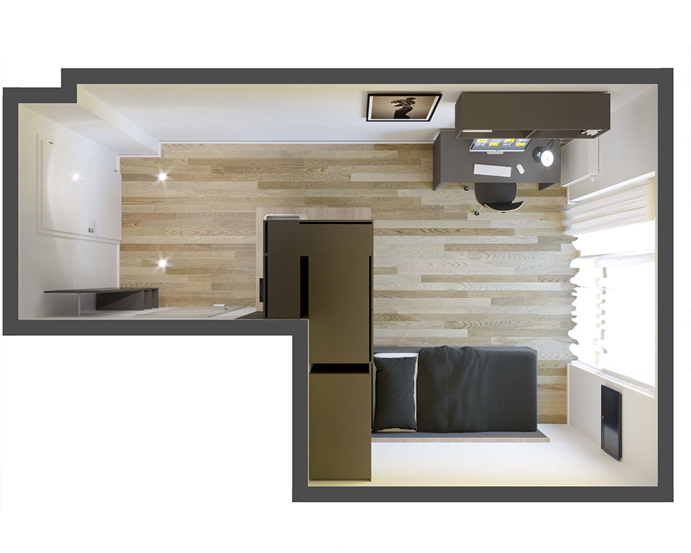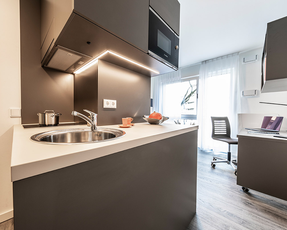 Ein weiterer Beleg für die hochwertige Ausstattung, sind die von Objekt und Küche Microliving gelieferten Boxspringbetten mit erstklassiger Qualität, sowie einem flexiblen Schreib-/Esstisch auf Rollen.